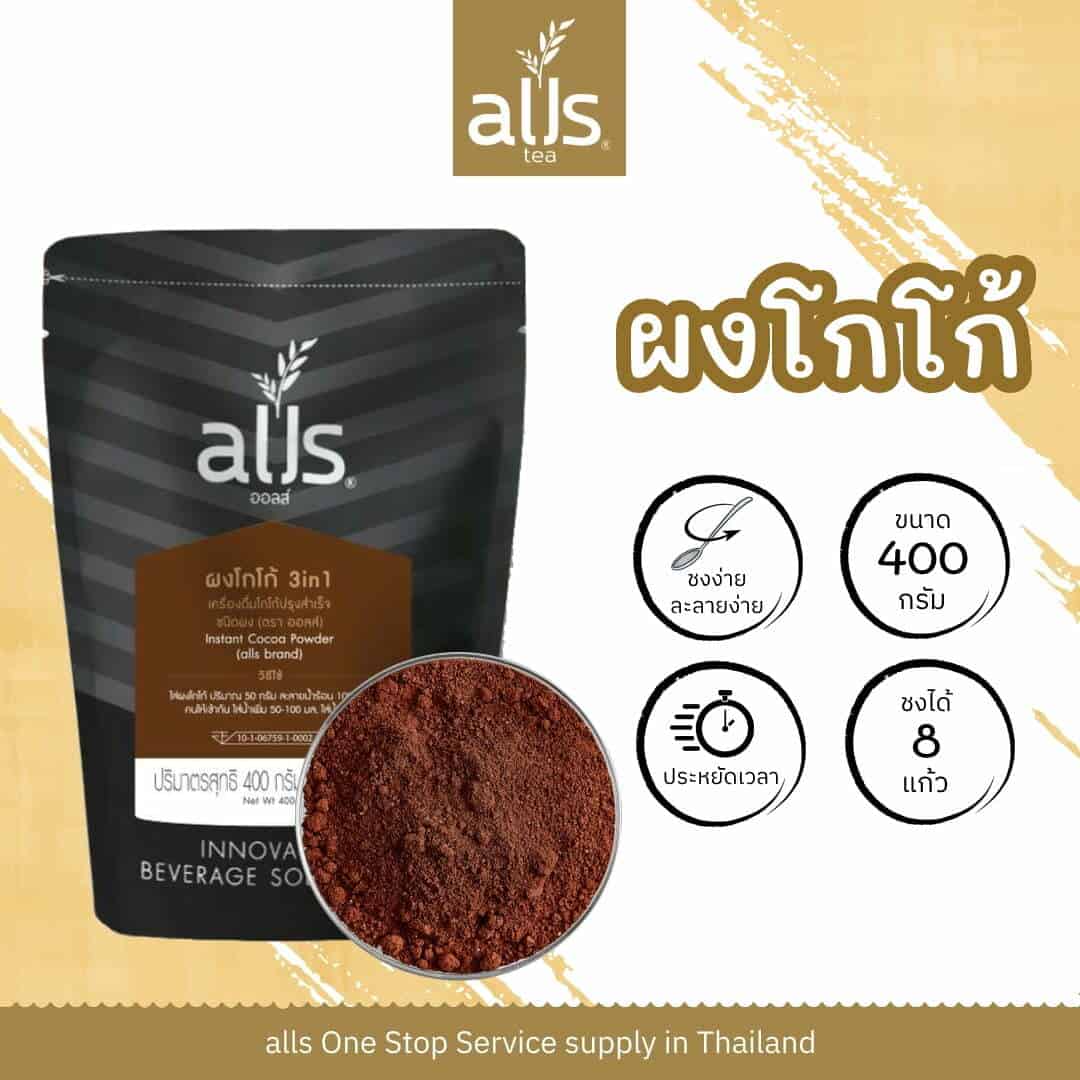 วิธีชงเครื่องดื่มผงโกโก้3อิน1 (ตราออลส์) 1.ละลายผงเครื่องดื่ม 50 กรัม ในน้ำร้อน 100 มล. 2.ใส่น้ำเพิ่ม 50-100 มล. 3.ใส่น้ำแข็ง พร้อมเสิร์ฟ